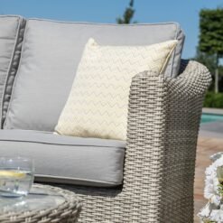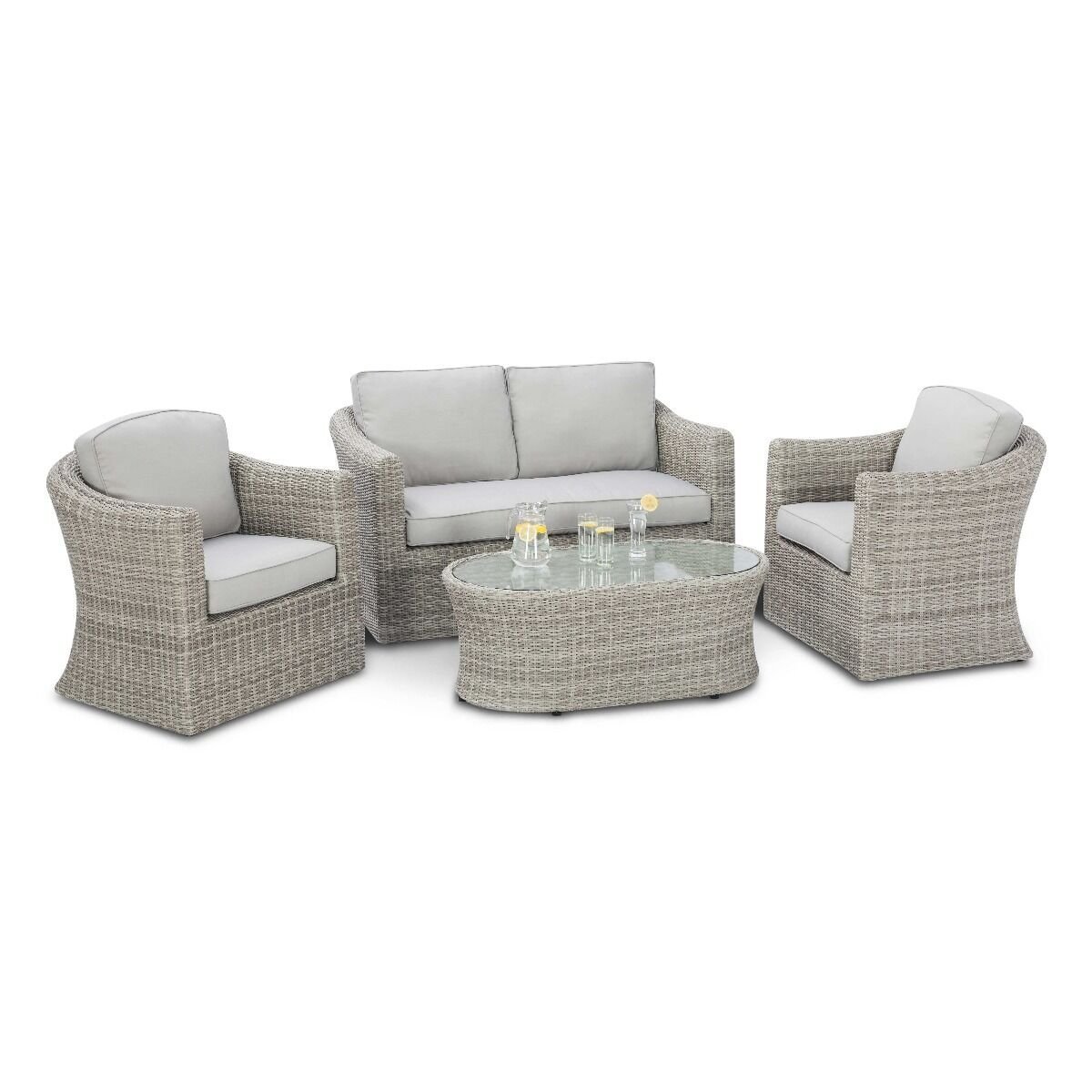 The Oxford 2 Seat Sofa Set by Maze includes a luxurious two seat sofa combined with a matching pair of rattan armchairs. Included is a large oval-shaped coffee table, topped with clear tempered glass. This set is recognised for the chunky curved shaped arms and backs to the sofa set. The grey rattan range combines the classic look with a beautiful grey coloured weave that creates a timeless finish. The grey coloured outdoor cushions sit perfectly with the premium half round weave, creating a modern, elegant style. We recommend storing cushions inside overnight. As with all Maze products, this 2 seat sofa set is made from the highest quality material, woven onto a powder-coated aluminium frame that ensures its use all year.